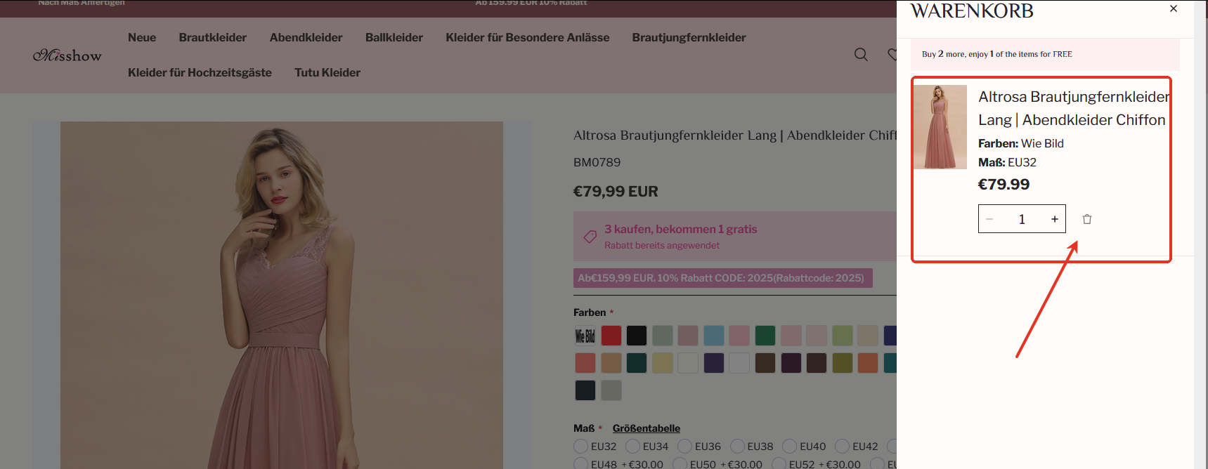 2. Überprüfen Sie den Artikel, Farbe, Größe und Menge die von Ihnen ausgewählte und klicken Sie dann auf IN DEN WARENKORB LEGEN.