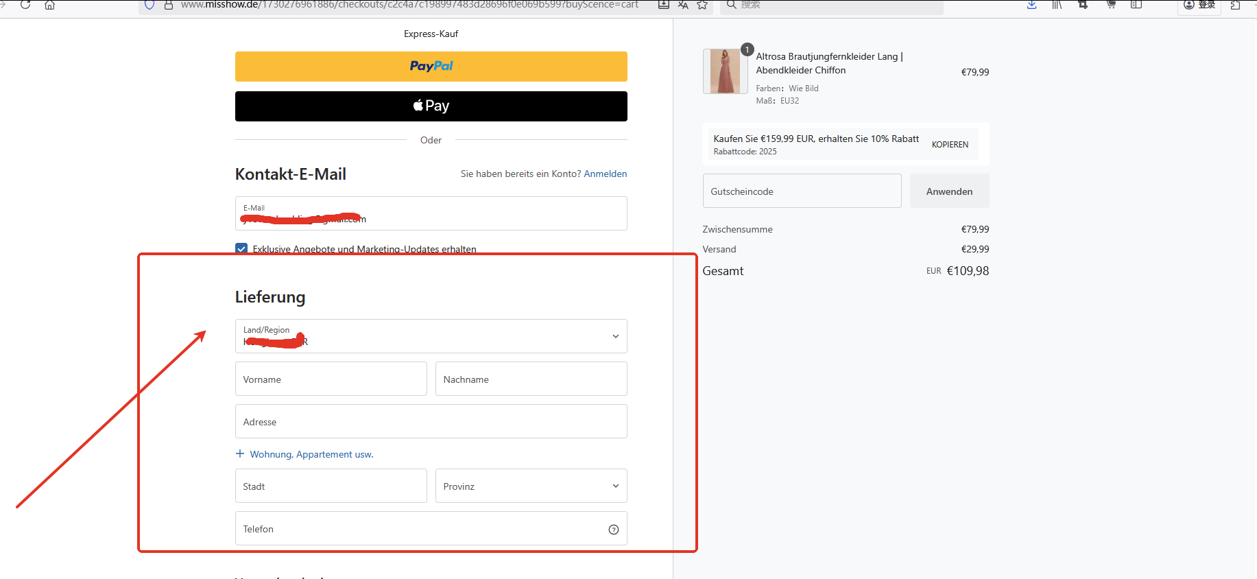 1. Geben Sie Ihre Lieferadresse, Ihre Kontaktdaten und alle weiteren Informationen an, die für die Zustellung Ihrer Bestellung erforderlich sind.